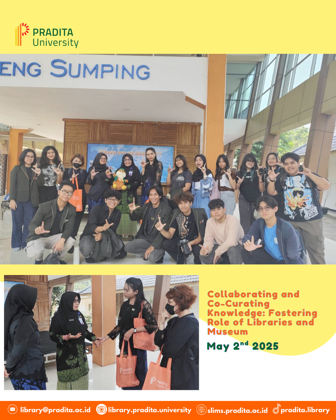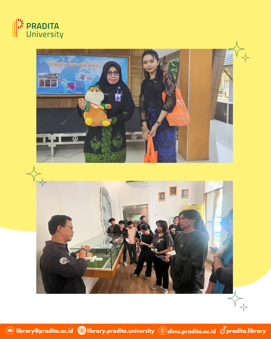 In a strategy to foster collaboration with other information institutions, including public libraries and museums, the Library conducted an Information Literacy event on Friday, May 2, 2024, in cooperation with Pradita University's Architecture study program. With the goal to benchmark the variety of literacy services and the introduction of local culture through library building design, the event began with visiting to the Dinas Perpustakaan dan Kearsipan Kabupaten Lebak , Miss Anindya Ambar Wati, S.S.I., M.Hum. The library coordinator conformed to with Mrs. Kadarina, S.P., M.Si., as the representative of Dispusar Kabupaten Lebak.